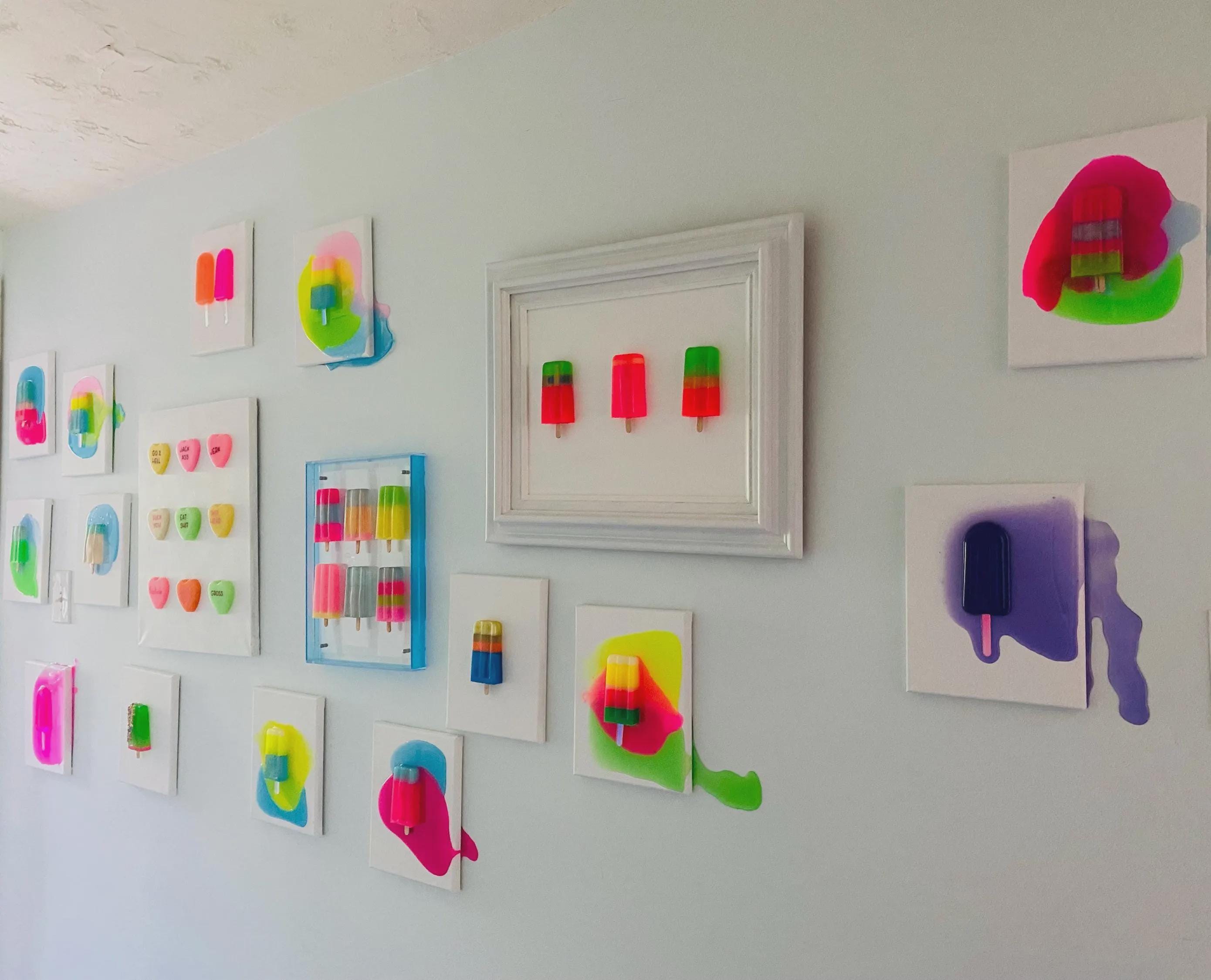 Each popsicle is individually cast in resin and mounted on a framed canvas, creating a dimensional composition that blends sculpture with pop art. The arrangement balances color, nostalgia, and minimalism, making the piece feel both joyful and elevated.