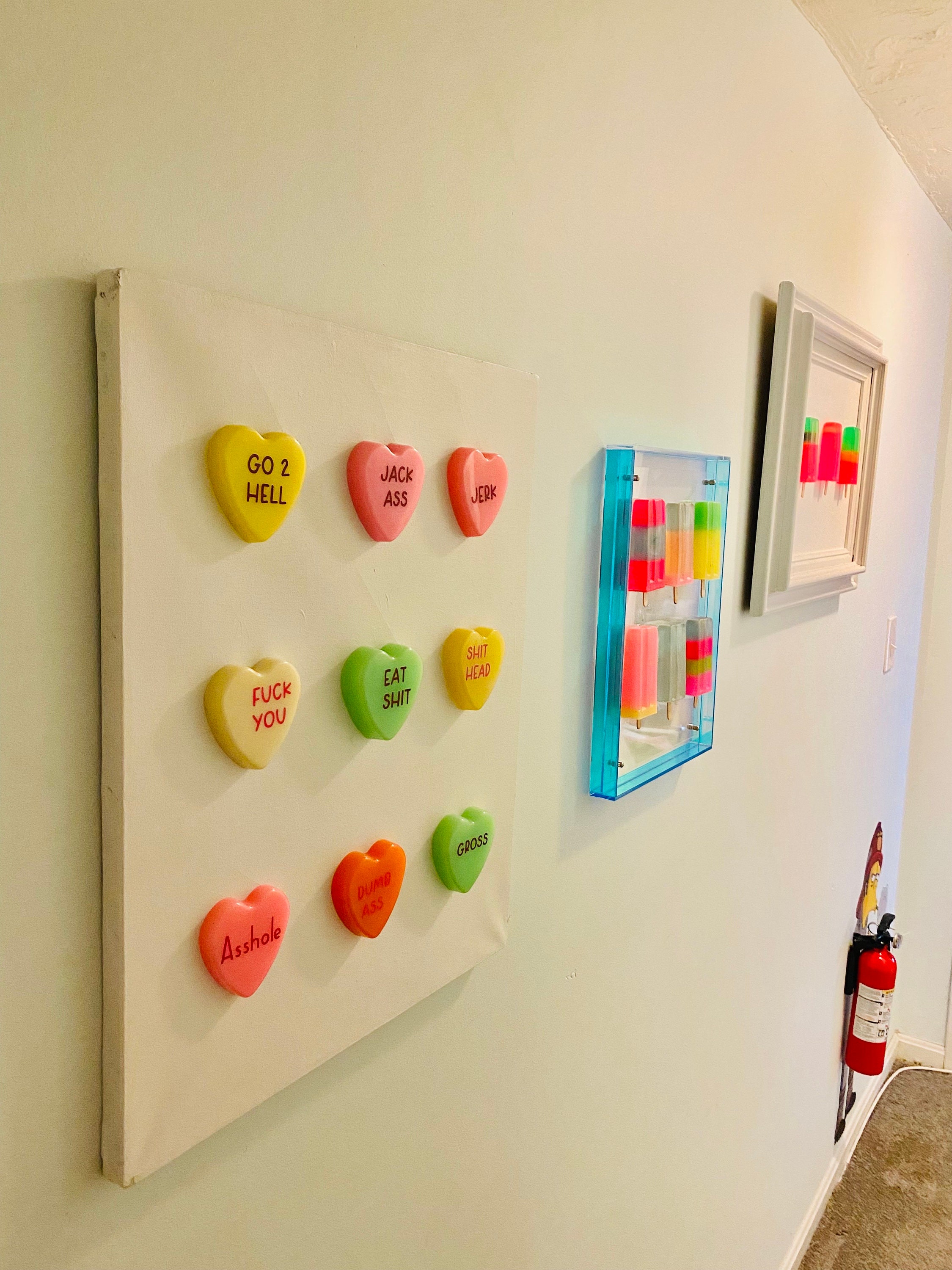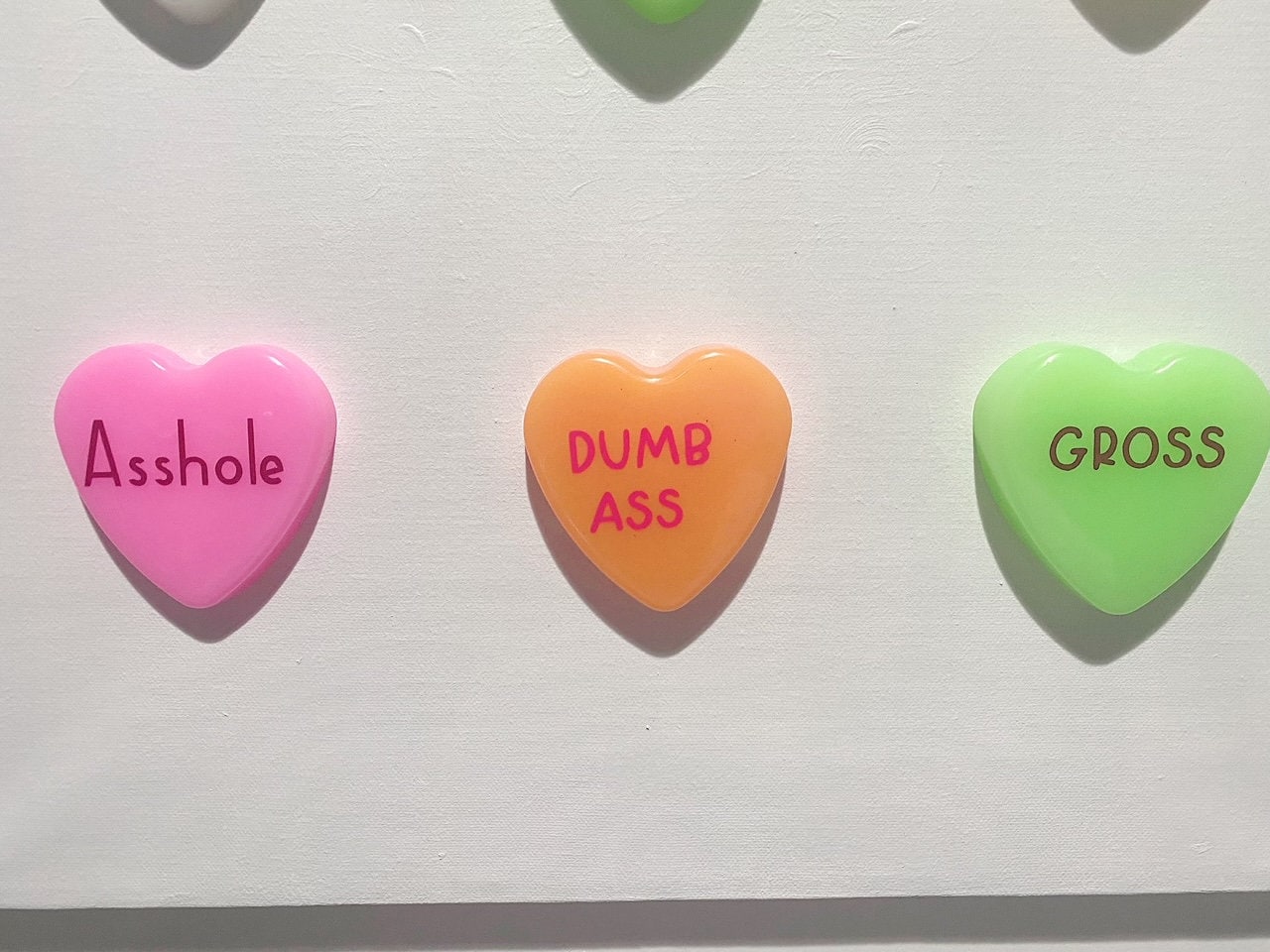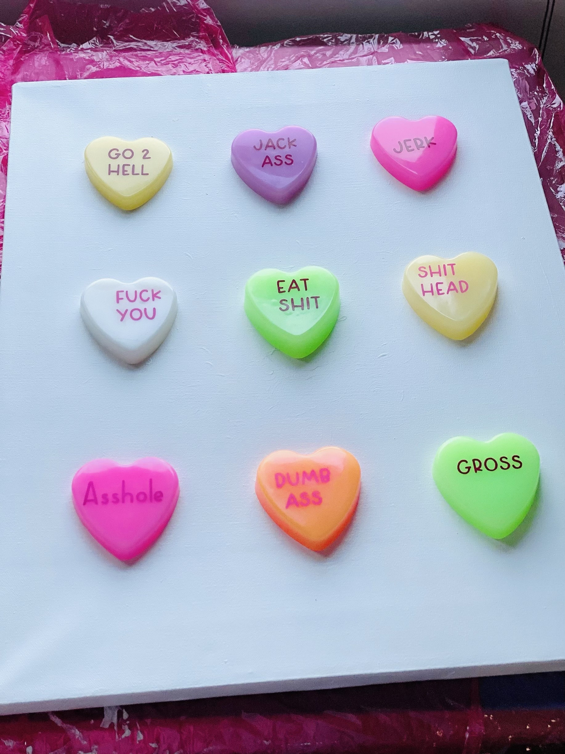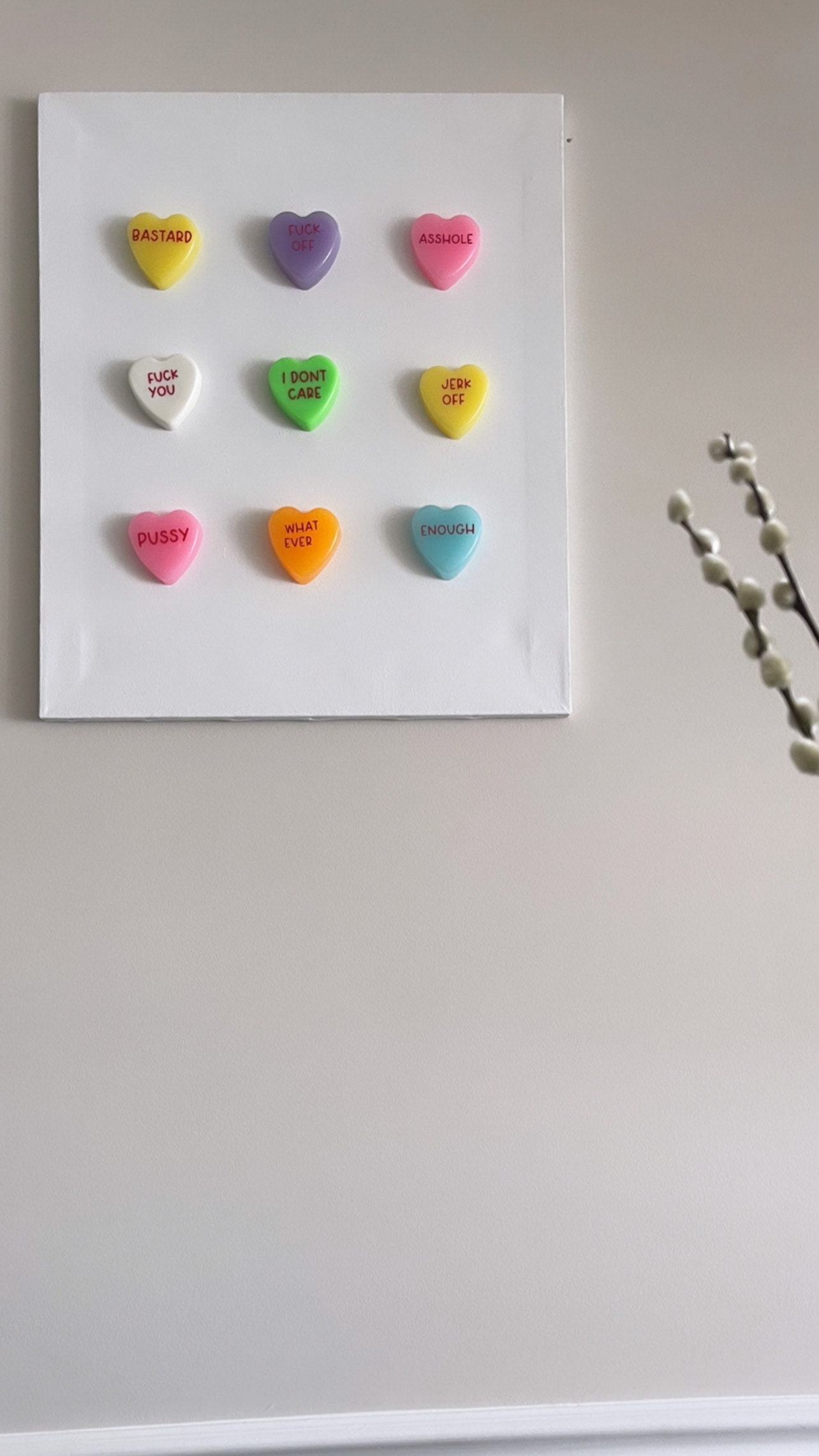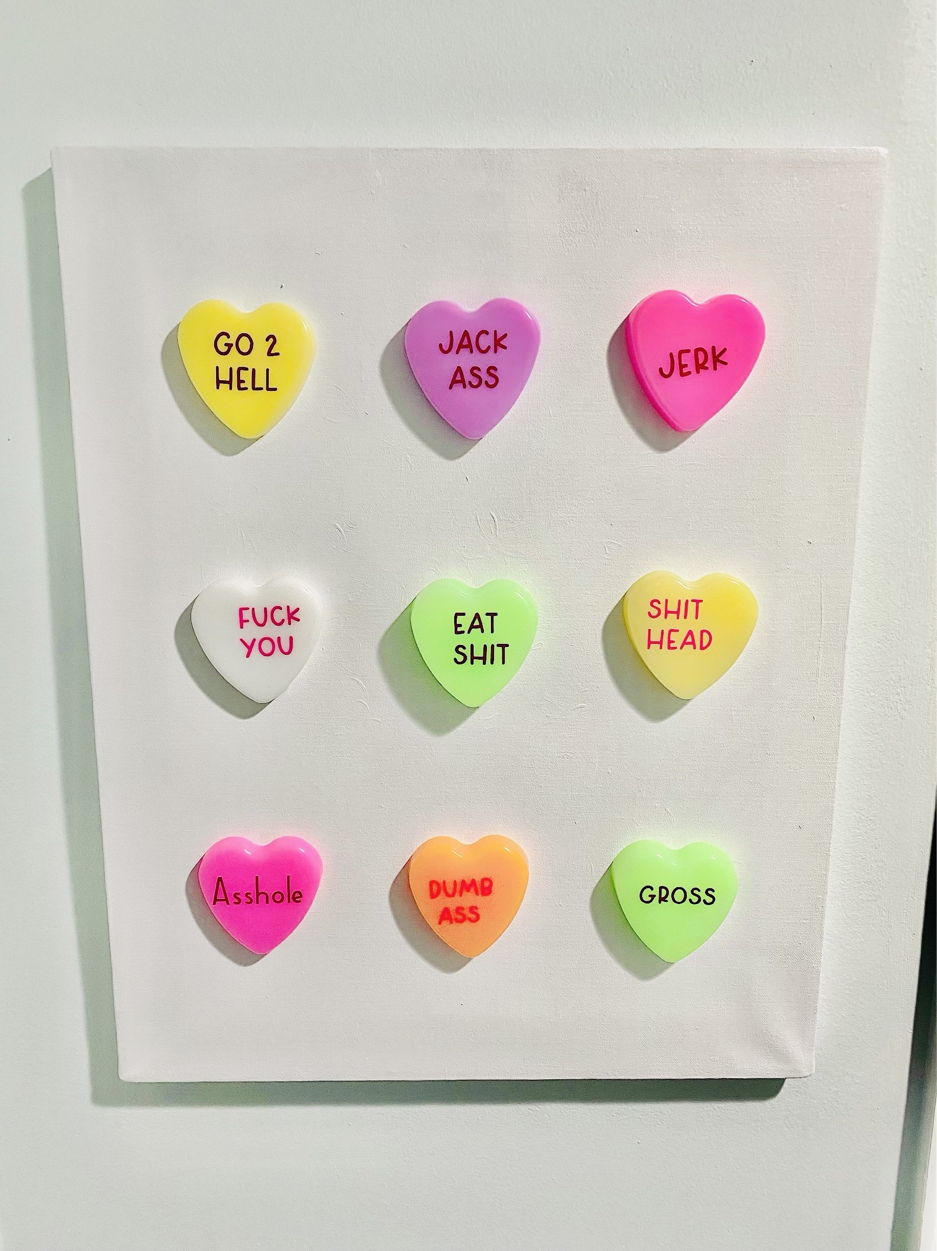 Remember when you use to get Sweethearts from crushes! Now you have Mean Hearts as a funny token of loves in the past. Mean Hearts or Sour Hearts either way you put it, its a hilarious and cool conversation art piece.
