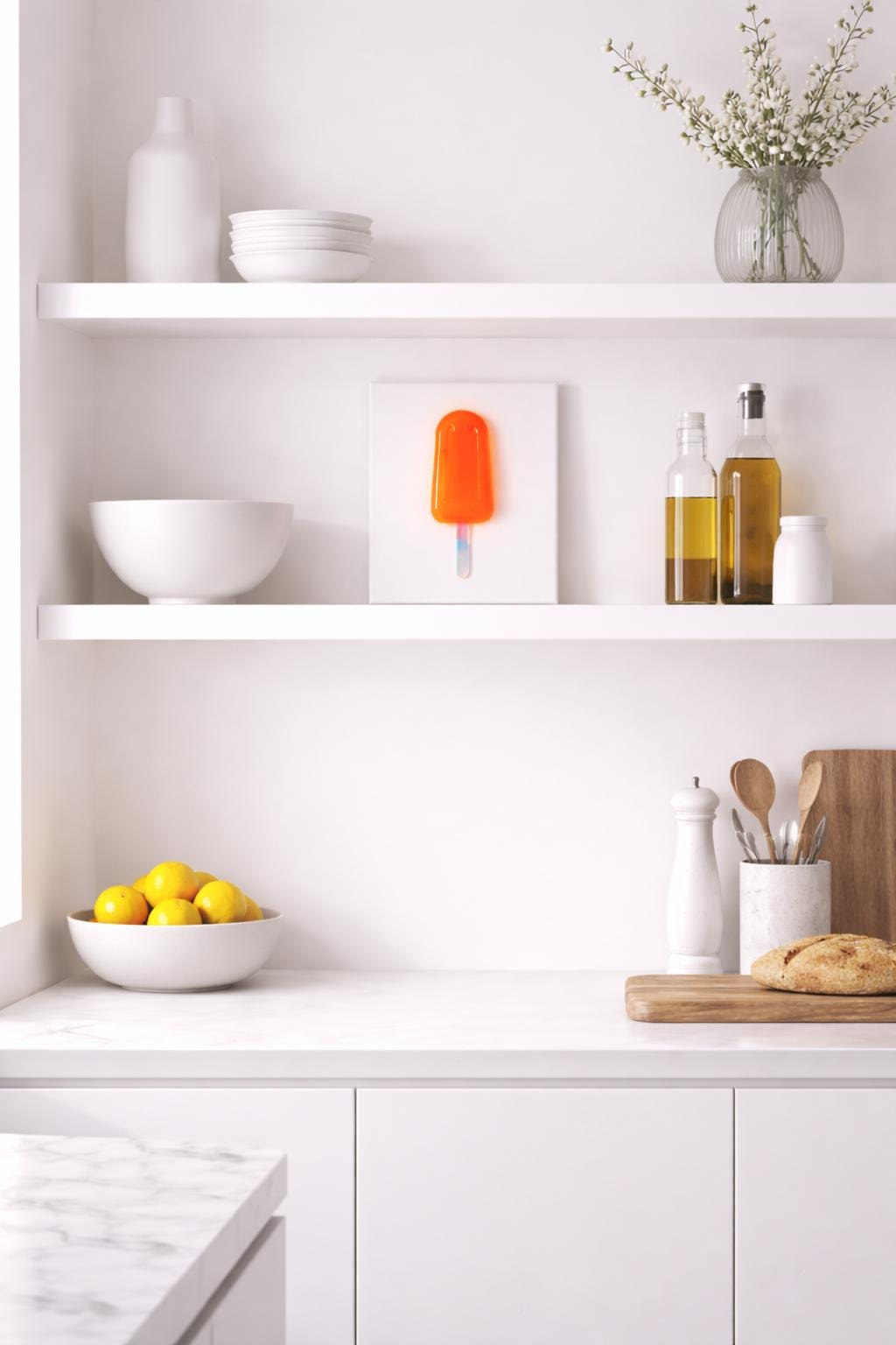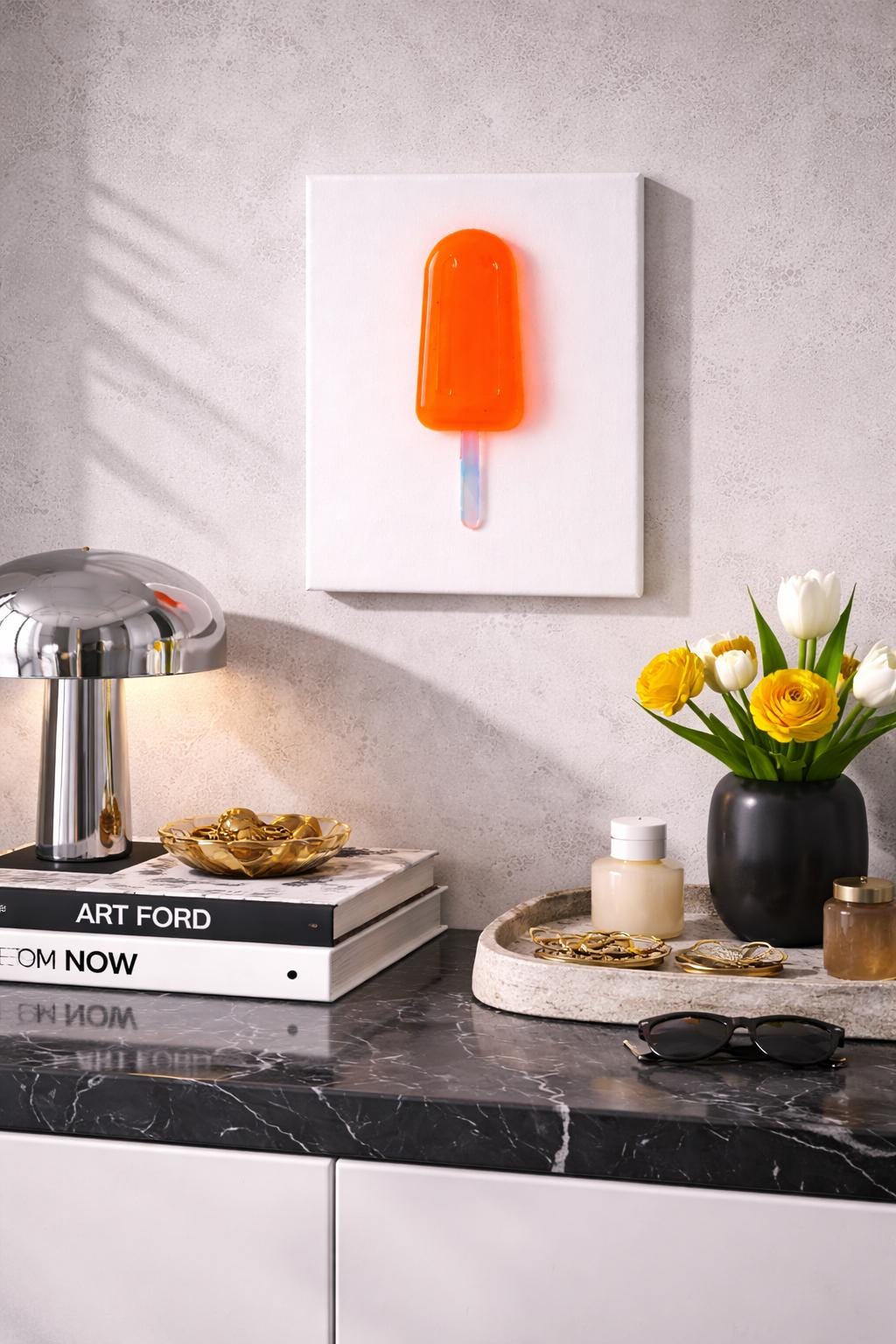 Unmelt No. 07 holds form without collapse. A vivid translucent orange popsicle rests in disciplined stillness, suspended against clean white space.