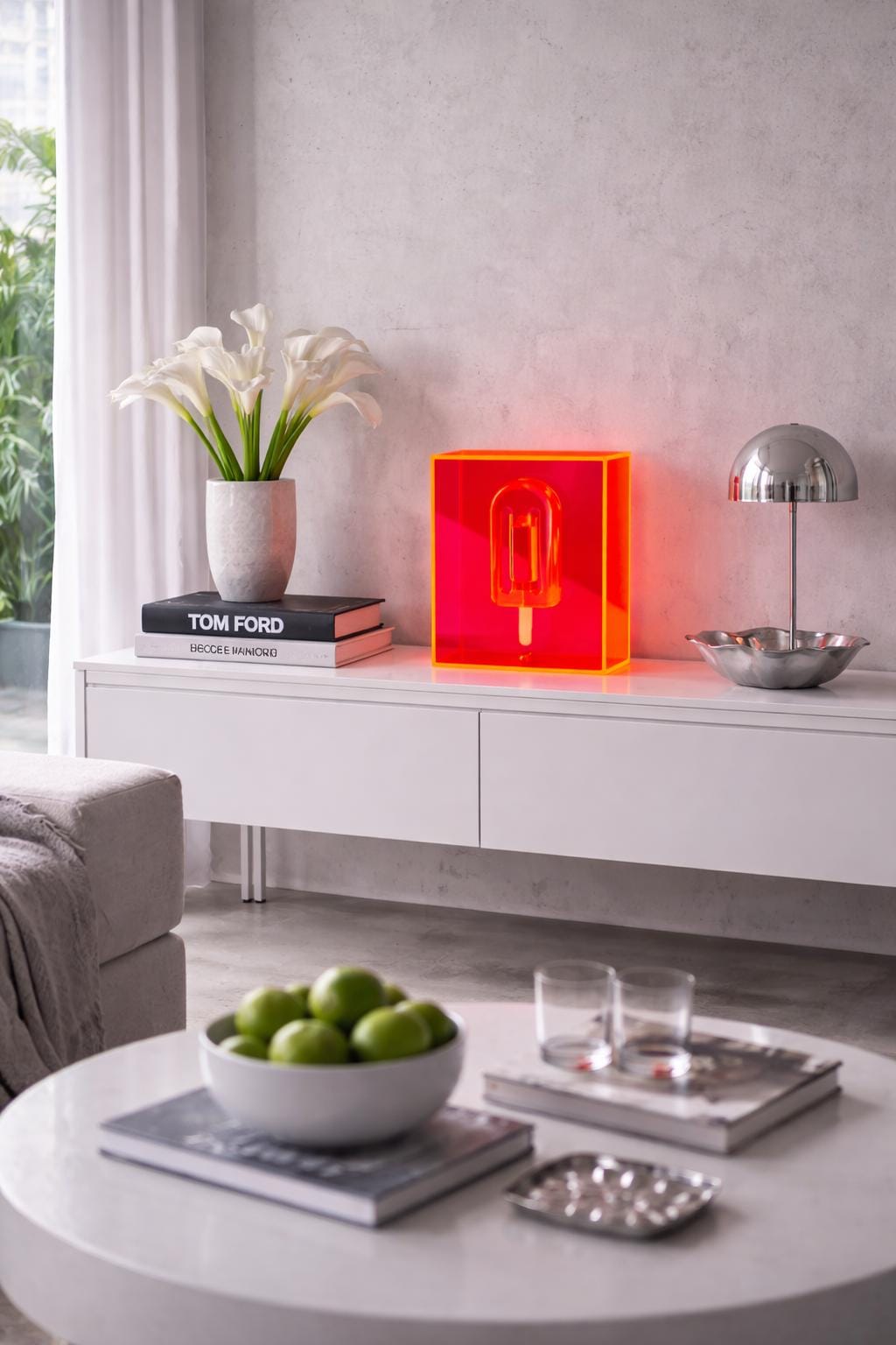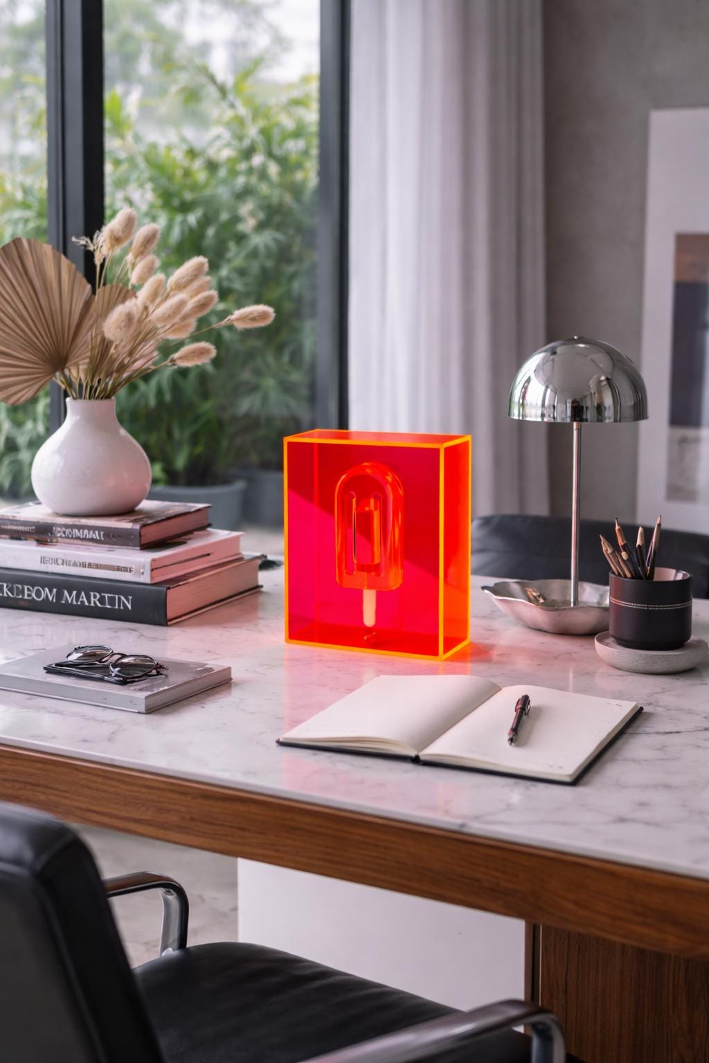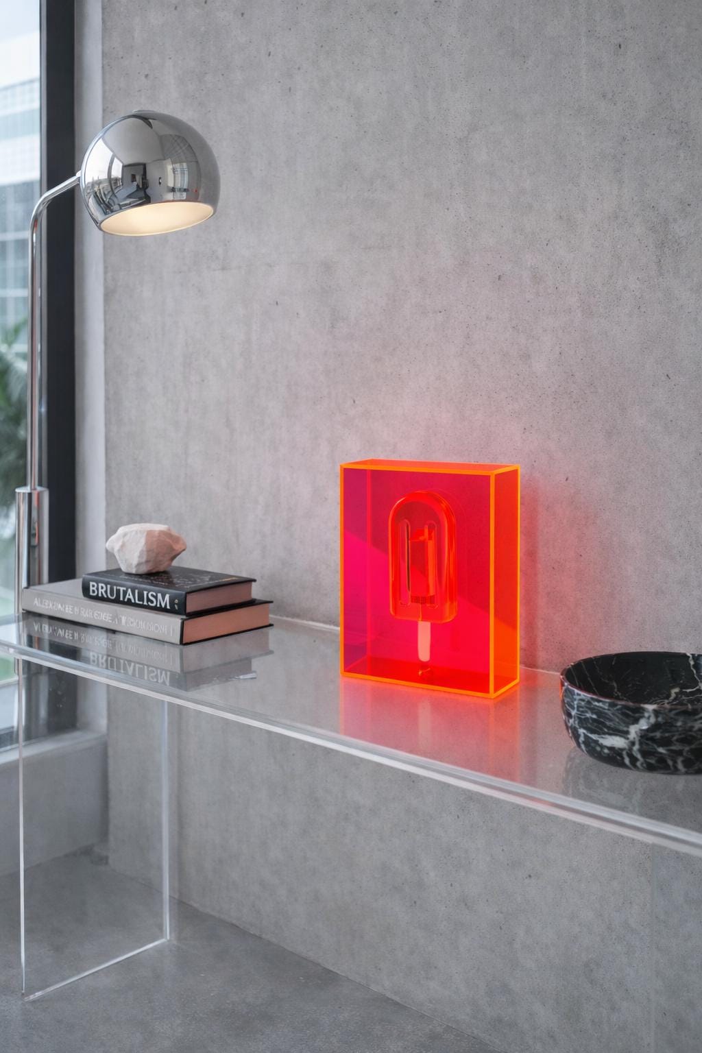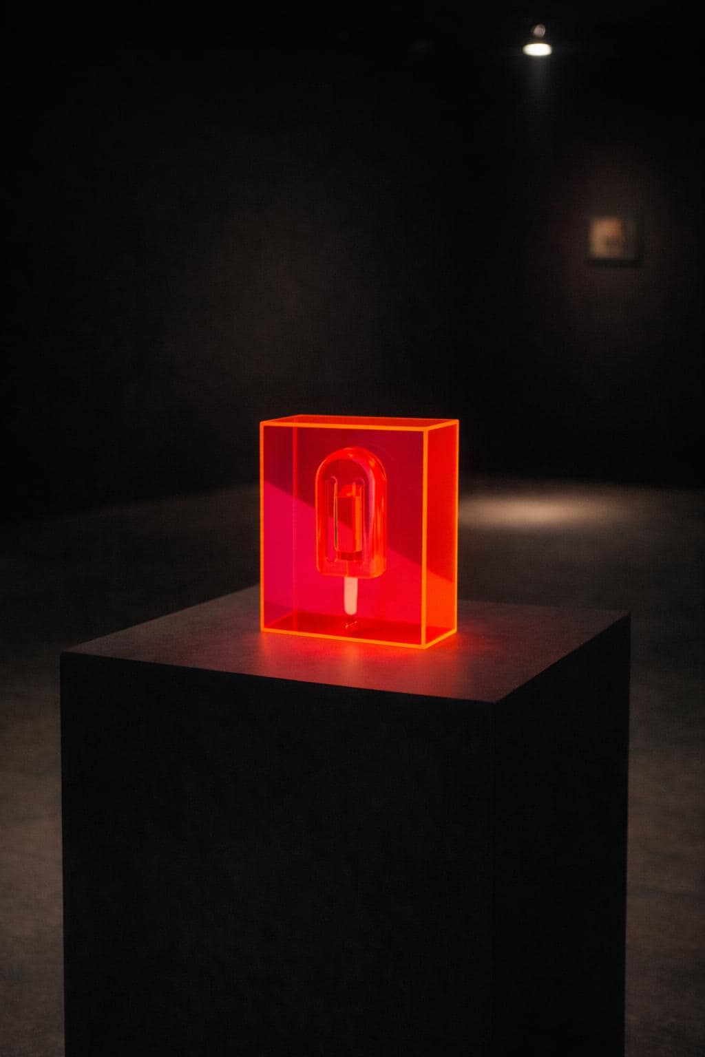 Unmelt No. 06 is a sculptural resin popsicle preserved within a translucent acrylic block. The form is frozen mid-stillness, encased in saturated neon structure that transforms light into part of the composition.