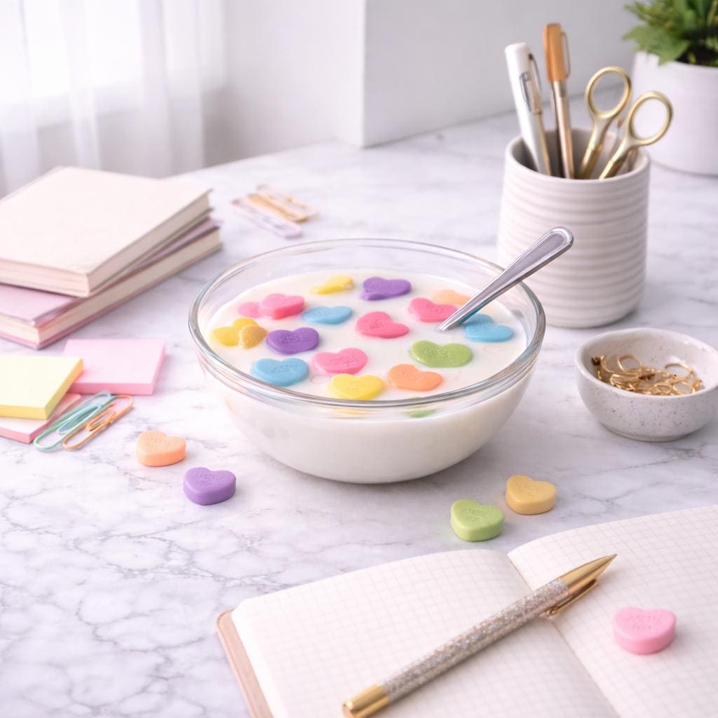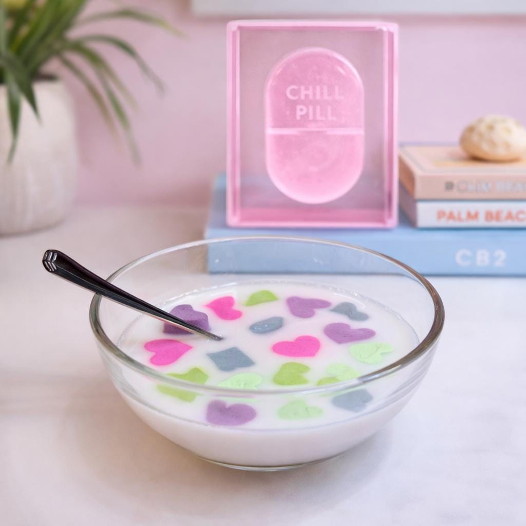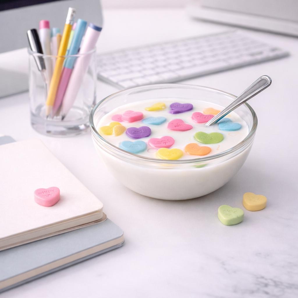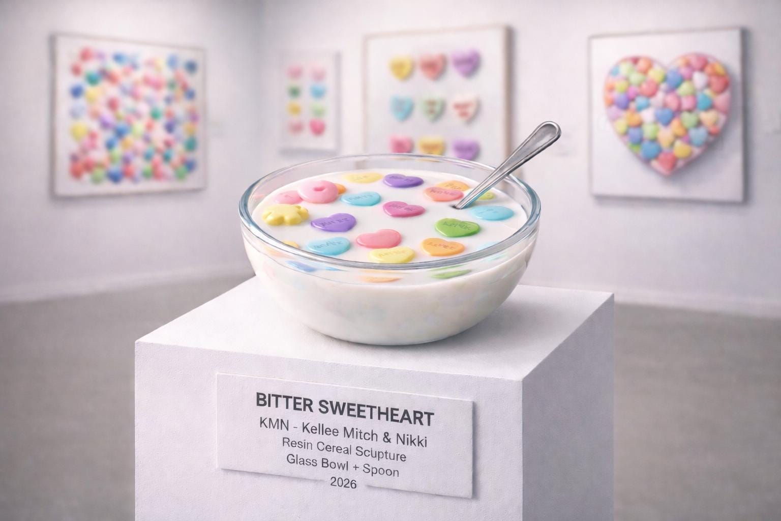 Bitter Sweetheart No. 05 is a freestanding resin sculpture — a real glass bowl filled with resin milk and a collection of colorful candy hearts suspended mid-float, spoon included. It looks exactly like a bowl of cereal. It is also completely, seriously, a piece of art.