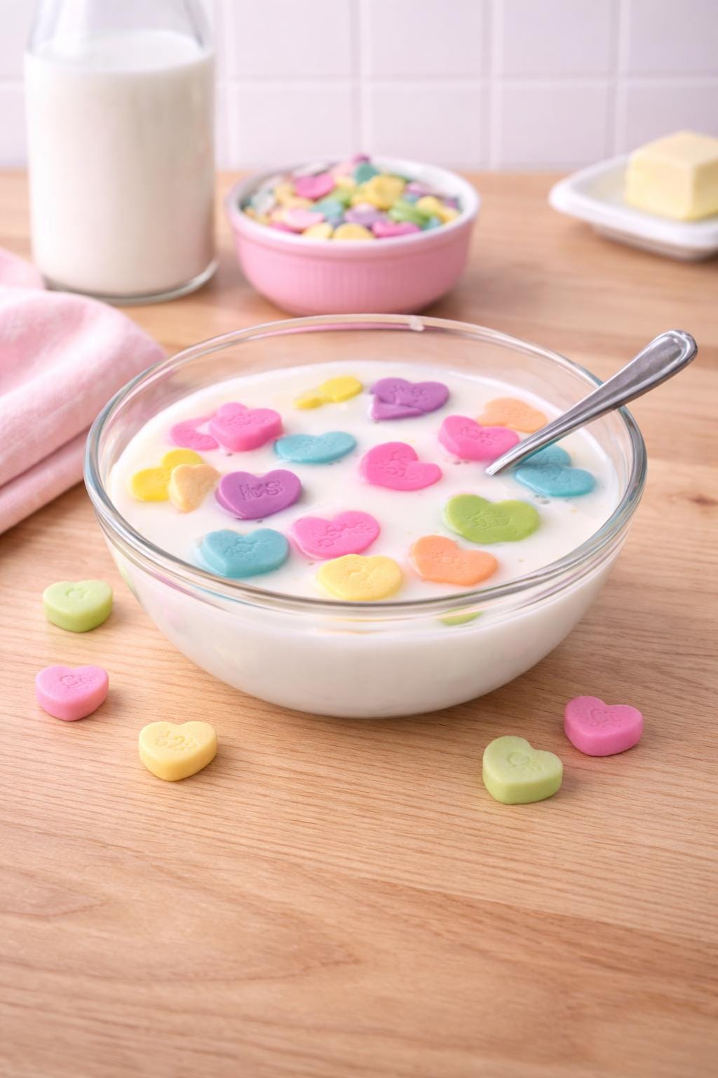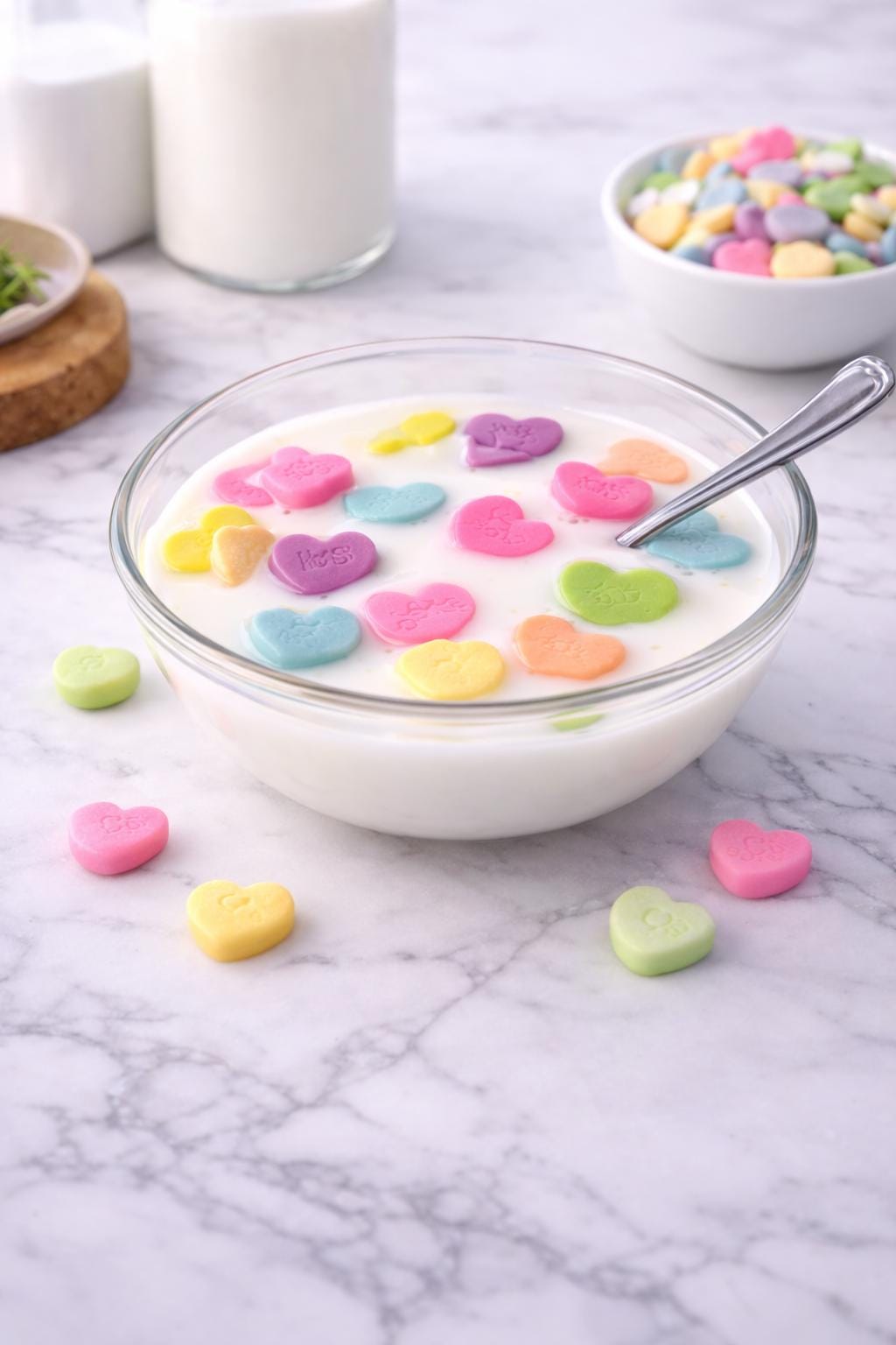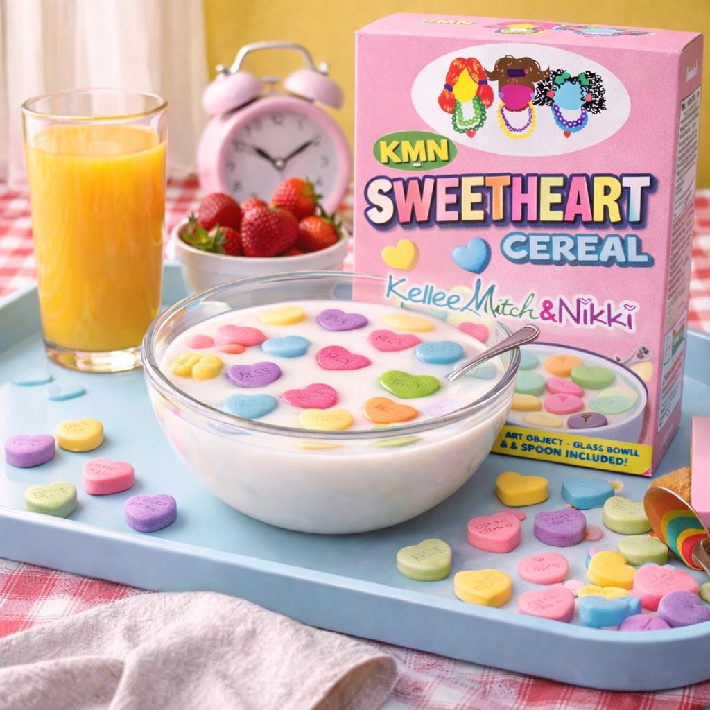 Bitter Sweetheart No. 05 is a freestanding resin sculpture — a real glass bowl filled with resin milk and a collection of colorful candy hearts suspended mid-float, spoon included. It looks exactly like a bowl of cereal. It is also completely, seriously, a piece of art.