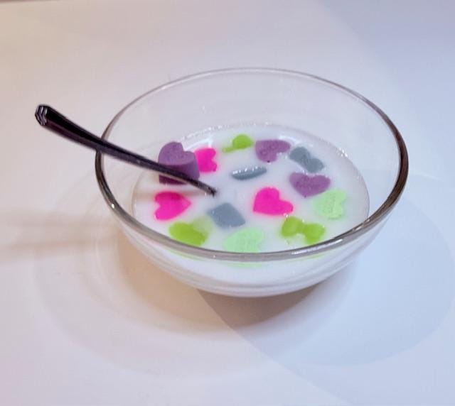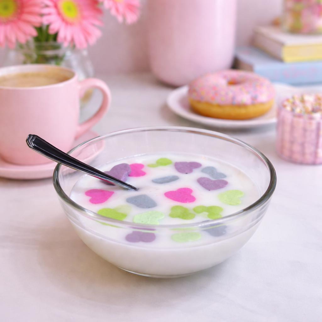 Pink. Green. Purple. Blue. The hearts sit in the resin the way cereal sits in milk — caught in the moment just before the spoon hits.